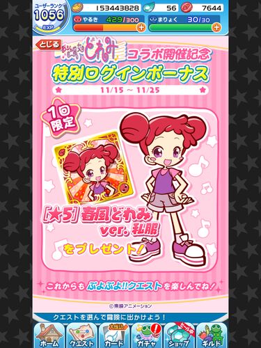 本日から11月25日まで、ログインボーナスとして1度のみ「春風どれみver.私服」が貰えます。 おジャ魔女懐かしいな〜 最近もらえたハロウィンカーバンクル同様☆6に変身出来ません。 リーダースキル 属性に関係なく無条件に2倍近くまで攻撃力と体力をあげてく…