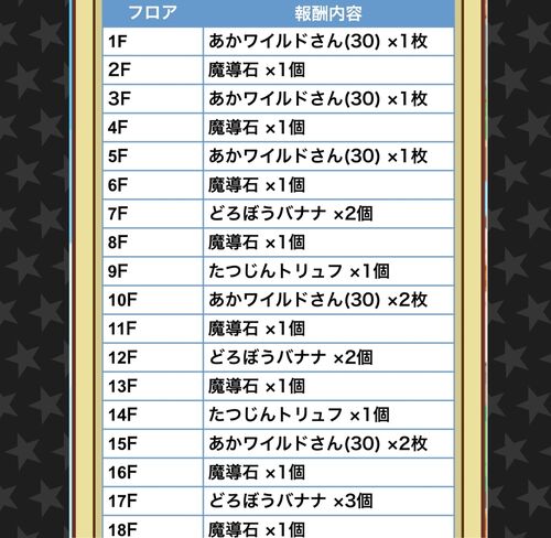 不定期に報酬がリセットされる「とことんの塔」。 どんなアイテムがどれだけ手に入るのか気になり 今月初めにスクショを撮っておきました。 (更新: 2019年12月) まとめると… 魔導石×20 どろぼうバナナ×30 たつじんトリュフ×3 ☆6土星ぷよ×10 ワイルドさん(30)…