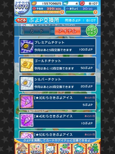 月一でシルチケ、ゴルチケ、プレチケをぷよpで一定数交換できますが今月はどうか。 まずはプレチケ アーケードキャラ☆7にならないかな ゴルチケ 魔人だ、フルシュ結構来る シルチケ もう1枚の魔人 ☆3が半数 …ところでむらさきアイス21日?と気がついた。 全…
