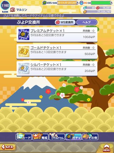 月一でシルチケ、ゴルチケ、プレチケをぷよpで一定数交換できますが今月はどうか。 プレチケ ミヤビはお正月っぽい ゴルチケ お正月早々眠いよね シルチケ ☆3多め そういやぷよクエでトラキャラっていたっけ? では!