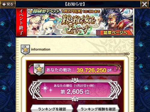 イベントお疲れ様でした。 2度目の3000位以内 5000位以内を目指していたものの、石10個の差が気になってしまいました。 前回疲れたからもう二度と3000位を目指さないと思ったのに。 ギリギリまで遊んでこんな場面に出くわした どうせなら4000万行きたかった…