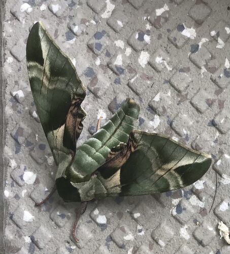 ベランダに葉っぱが落ちていると思ったら、蛾でした。 大きさは500円玉より一回り大きいくらい。 形も色もカッコいいし可愛い。 一部枯葉の色も再現しています。 風が吹くと体全体で少しユラユラさせていました。 検索したら、ウンモンスズメという名前でし…