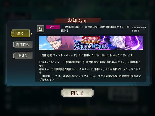 お正月ということで1月1日2日3日の各1日ごとに10連ガチャ無料です! キャラか残滓のSSR確定!太っ腹! 1日目の結果は… newはなかったけどSSRキャラ・残滓をゲット! 虎杖達はガチャ結果を拝んでくれていた…? 笑 では! モフモフした服が足りないからだよ