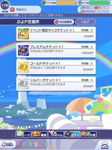 月一でシルチケ、ゴルチケ、プレチケをぷよpで一定数交換できますが今月はどうか。 イベント限定キャラチケットが加えられていました。未所持イベントキャラはいますがスルーします。 プレチケ 赤だらけ ゴルチケ やっぱり赤多め シルチケ 3人で1枚のカード…